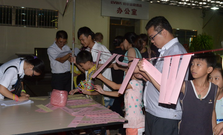 晚上八點(diǎn),圓月高高掛在天空,在一陣舒緩的音樂(lè )聲中,茶話(huà)會(huì )拉開(kāi)了序幕,大家開(kāi)始品嘗美味的花生、雞腳、田螺,喝起了冰爽的汽水、啤酒,熱鬧非凡。期間,劉總依次走到每席前,舉杯向大家送上節日的祝福。這樣的場(chǎng)合里,沒(méi)有了工作時(shí)的正式和嚴肅,大家互道著(zhù)祝福,互敬著(zhù)啤酒。一幫年輕的同事和小學(xué)生家屬,則圍著(zhù)猜迷區,為了一個(gè)個(gè)燈迷而絞盡腦汁。再小一點(diǎn)的孩子家屬,則拿著(zhù)熒光棒互相追逐叫喊著(zhù)。氣氛相當熱烈,相當盡情。