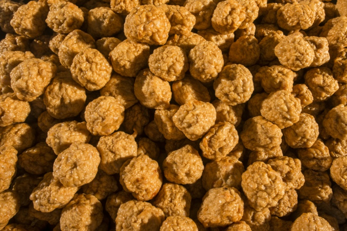 選取里脊肉和后腿的瘦肉,制作酥丸除了調味的鹽等調料,不添加面粉或其他材料。另一個(gè)關(guān)鍵是水。首先,不能用清水清洗豬肉,要用刀輕輕地刮去粘在肉面上的其他雜物,并且去掉其中的肥肉。在捶打瘦肉的過(guò)程中,不能添加任何水分,直至瘦肉捶打成肉漿成膠狀時(shí),才可以往其中加入鹽水。為了更好控制肉中的水分,避免更多的水分進(jìn)入肉丸,擠捏好的丸子不能放到水中浸泡,而是要放入花生油中浸泡。擠捏好肉丸之后便可以下油鍋炸了。在鍋中倒入一定的油,把油溫燒到10℃~20℃,就把肉丸同浸泡肉丸的花生油一起倒入鍋內,然后迅速加溫使油鍋溫度升高至120℃,不斷地翻動(dòng)鍋中的肉丸以免肉丸粘連在一起。將肉丸炸至金黃色,便可撈出油鍋,瀝干其中的油就可以了。